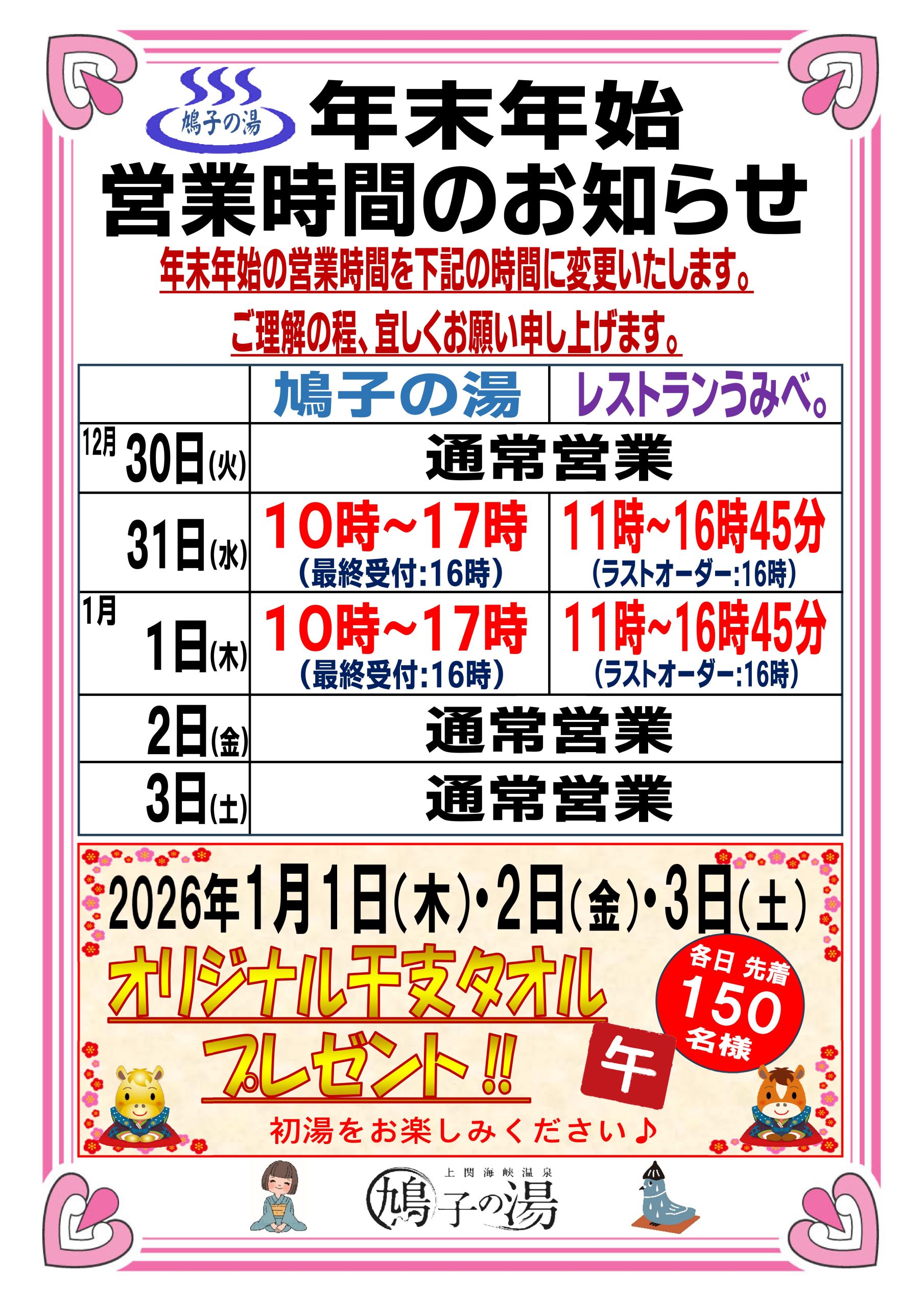 但し、2025年12/31(水)・2026年1/1(木)は営業時間を変更した時短営業となりますのでご確認をお願いいたします。