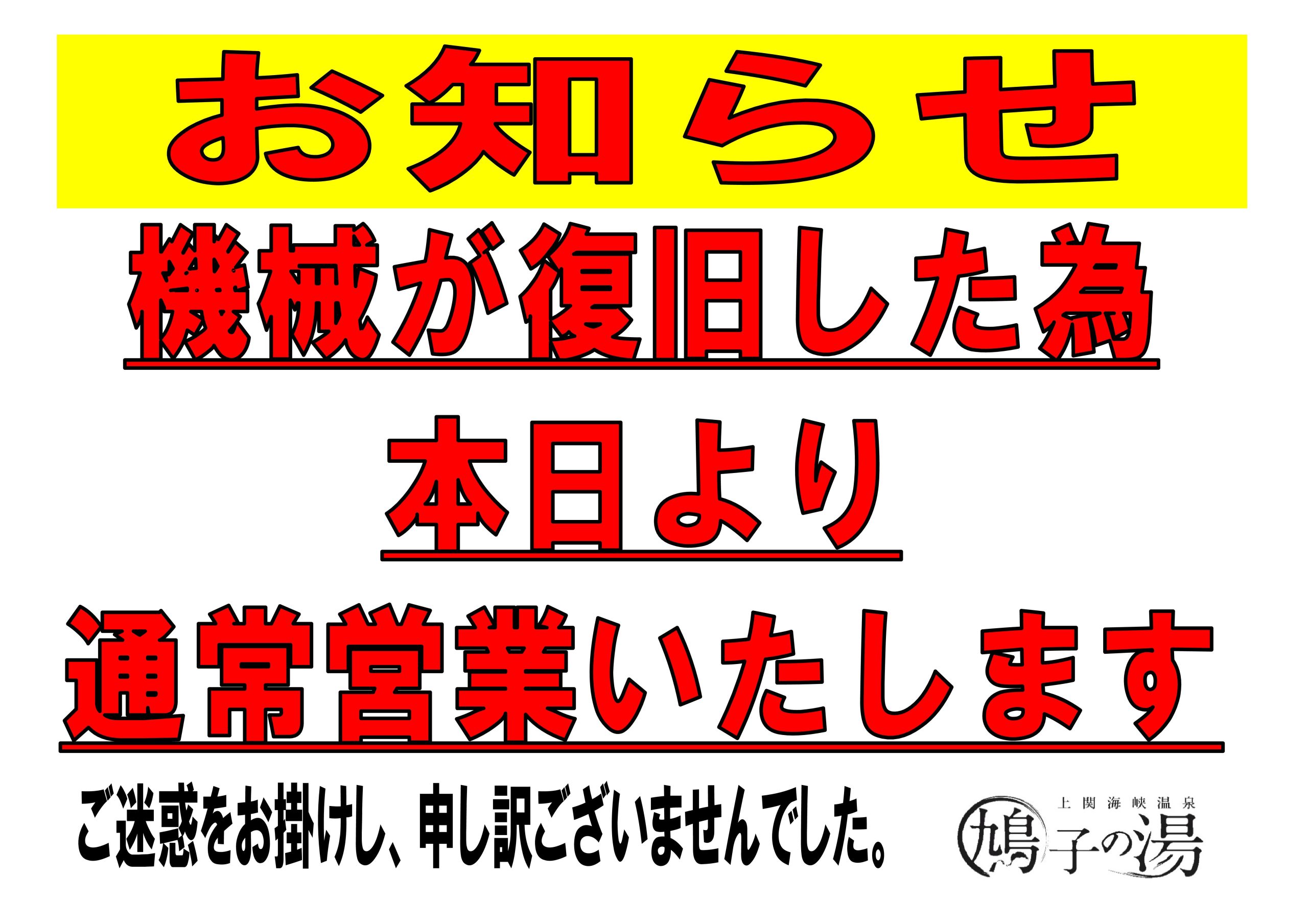 機械復旧致しましたので本日より通常営業いたします。 お知らせ2026.02.05 機械復旧致しましたので本日より通常営業いたします。 大変ご迷惑お掛け致しました。 ご来館お待ちしております。 新着情報一覧 カテゴリ 温泉 (138) レストラン (51) お知らせ (290) アーカイブ 2026年 2月 (1) 1月 (4) 2025年 12月 (6) 11月 (4) 10月 (5) 9月 (1) 8月 (3) 7月 (4) 6月 (3) 5月 (3) 4月 (3) 3月 (3) 2月 (2) 1月 (4) 2024年 12月 (4) 11月 (4) 10月 (2) 9月 (1) 8月 (2) 7月 (3) 6月 (3) 5月 (4) 4月 (3) 3月 (4) 2月 (3) 1月 (3) 2023年 12月 (7) 11月 (5) 10月 (3) 9月 (2) 8月 (3) 7月 (6) 6月 (4) 5月 (6) 4月 (6) 3月 (3) 2月 (4) 1月 (4) 2022年 12月 (3) 11月 (4) 10月 (1) 8月 (2) 7月 (4) 6月 (4) 5月 (3) 4月 (6) 3月 (2) 2月 (2) 1月 (7) 2021年 12月 (4) 11月 (4) 10月 (7) 9月 (6) 8月 (6) 7月 (2) 6月 (3) 5月 (3) 4月 (2) 3月 (3) 2月 (7) 1月 (6) 2020年 12月 (3) 11月 (4) 10月 (6) 9月 (5) 8月 (3) 7月 (4) 6月 (6) 5月 (7) 4月 (1) 3月 (4) 2月 (7) 1月 (6) 2019年 12月 (3) 11月 (6) 10月 (2) 9月 (8) 8月 (2) 7月 (4) 6月 (5) 5月 (4) 4月 (6) 3月 (1)